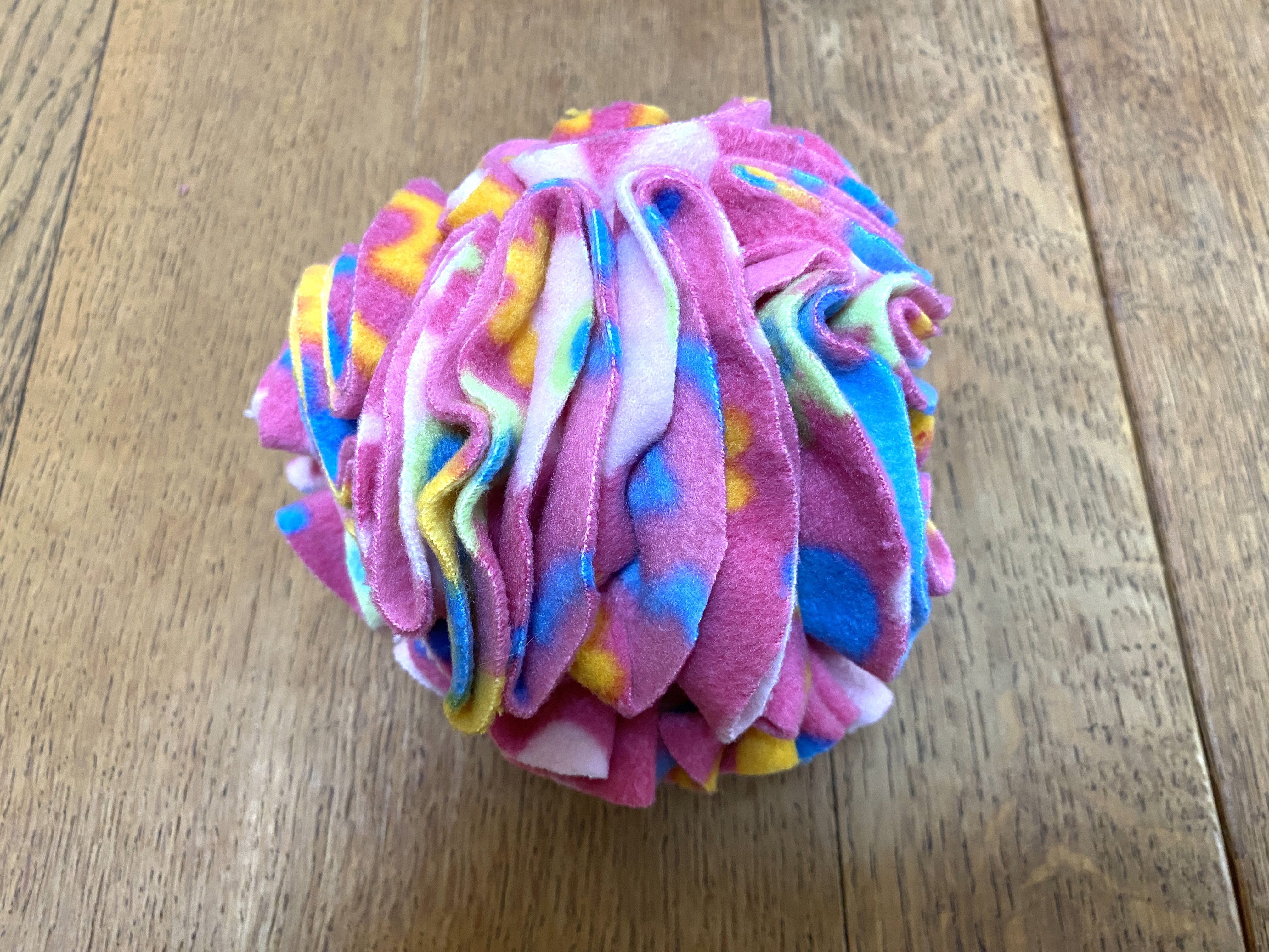 A pink 18cm (7 inch) snuffle ball with multi-coloured flower prints. £9 each, with £3.75 added to cover post and packing.